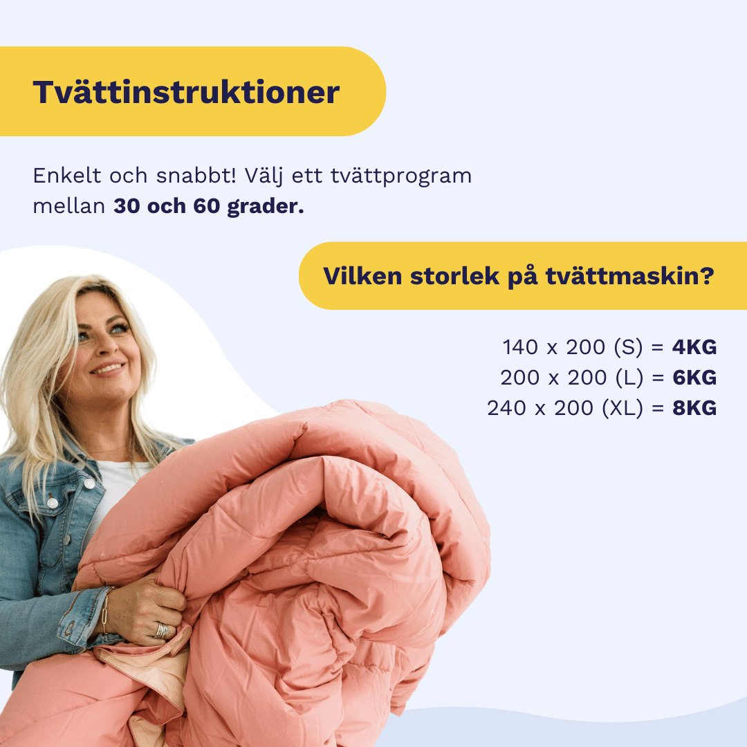Vi rekommenderar att du använder en tvätttemperatur på max 60 grader och ett varvtal på max 1000 varv (40 grader och 800 varv för optimal produktlivslängd). Genom att följa dessa tvättråd säkerställer du att ditt täcke känns fräscht, hygieniskt och som nytt. Dessutom kommer tvättmaskinen vid denna temperatur att ta bort torkade fläckar, kvalster, mögel och bakterier från ditt täcke.
